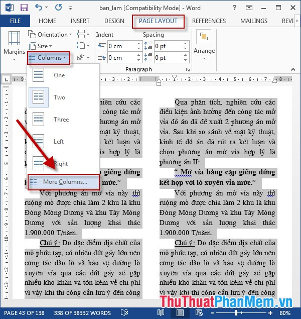 - Lựa chọn đoạn văn bản cần chia cột -> PageLayout -> Columns -> lựa chọn số cột cần chia, ví dụ ở đây lựa chọn chia thành 2 cột: