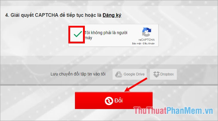 Bước xác nhận bạn không phải là người máy, các bạn có thể phải nhập 1 mã Captcha được yêu cầu hoặc đánh dấu chọn vào ô Tôi không phải là người máy và chọn Đổi.